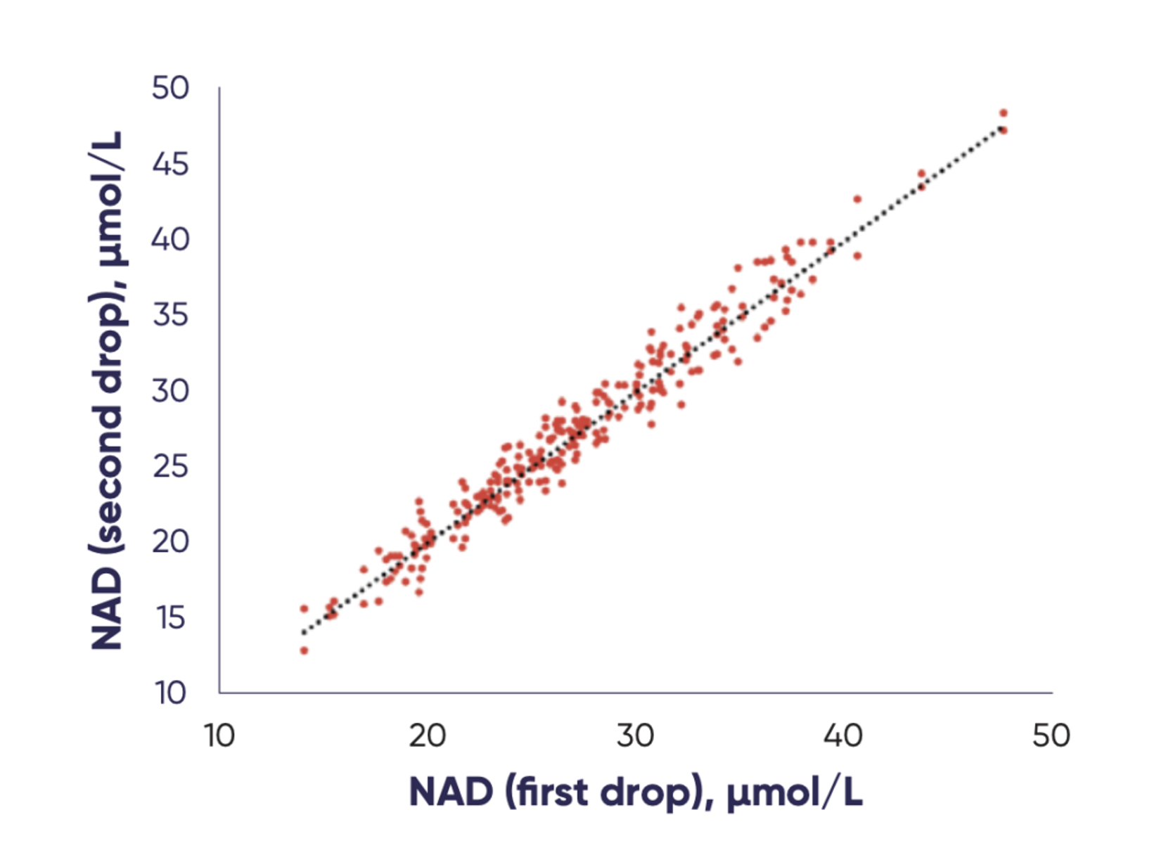 Figure 2. Evaluation of the Bloodo™ NAD Test reproducibility. NAD concentrations are given accounting for a dilution and represent total NAD concentration in human blood.