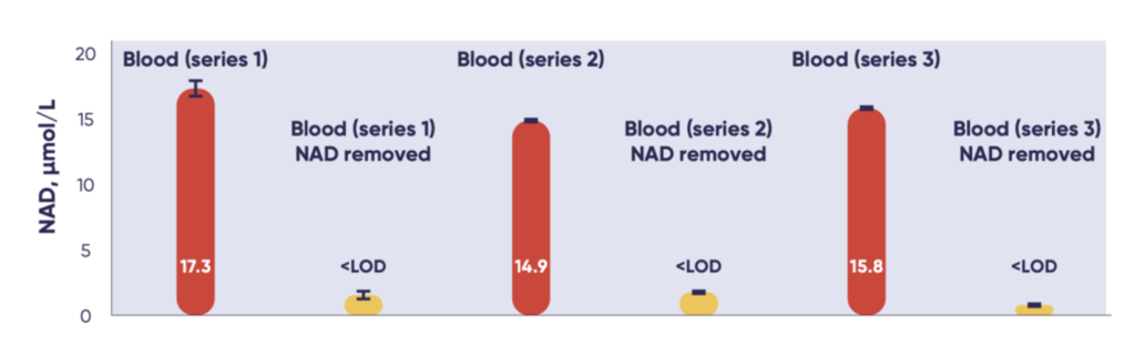 Control Testing for Accuracy: We’ve rigorously tested the Bloodo™ NAD Test to ensure it exclusively measures NAD. This included tests with and without the removal of NAD from samples (Fig. 4), confirming the specificity and reliability of our method.