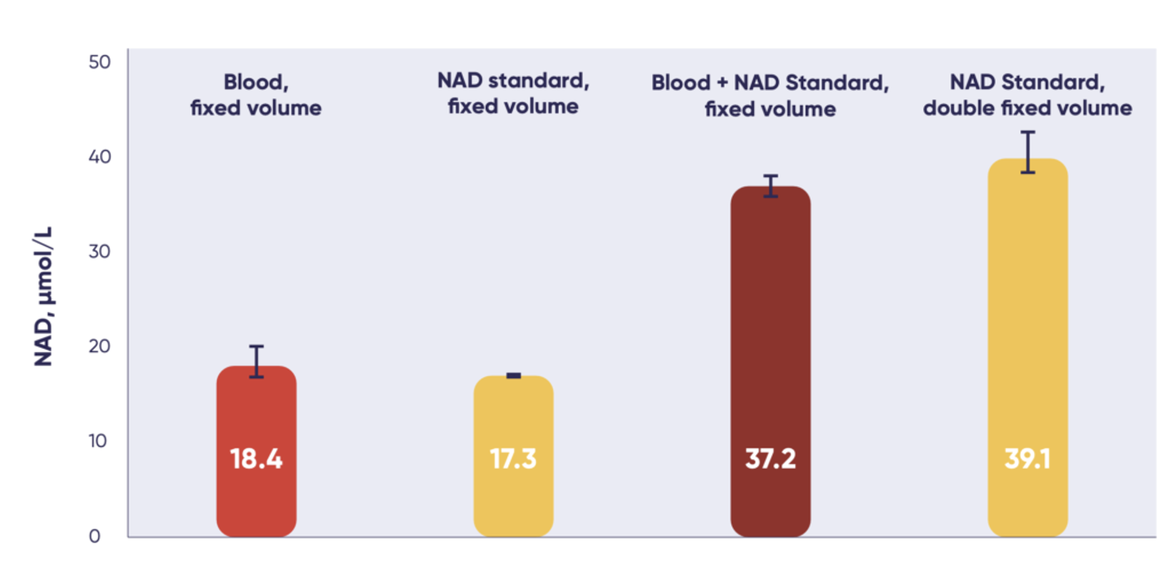 Additional controls were performed to confirm that the test accurately measures NAD. When a known amount of NAD was added to a blood sample, the test result increased by exactly that amount. This shows that the test works correctly and measures only NAD, without interference from other substances.
